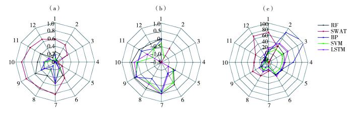 为更直观地反映不同模型对月径流量模拟的表现,进一步计算了不同模型月尺度模拟径流量的定量化评价指标(图4)。就R2而言,SWAT模型的模拟效果最好,7—12月的R2均在0.60以上,其次是RF模型。然而,NSE与R2的结果不同,SWAT模型在模拟期各月的NSE均为负;RF模型模拟的月尺度径流量效果较好,7—10月的NSE在0.50左右。就Bias而言,RF和SVM模型的Bias较小,各月的Bias均控制在30.00%以内,SWAT模型的Bias在1月、8月、9月和12月超过50.00%。根据R2、NSE和Bias的综合评价,RF模型在唐乃亥水文站的月径流量模拟效果较好,而SWAT模型适用于模拟长期年径流量,对于月径流量的模拟效果较差。