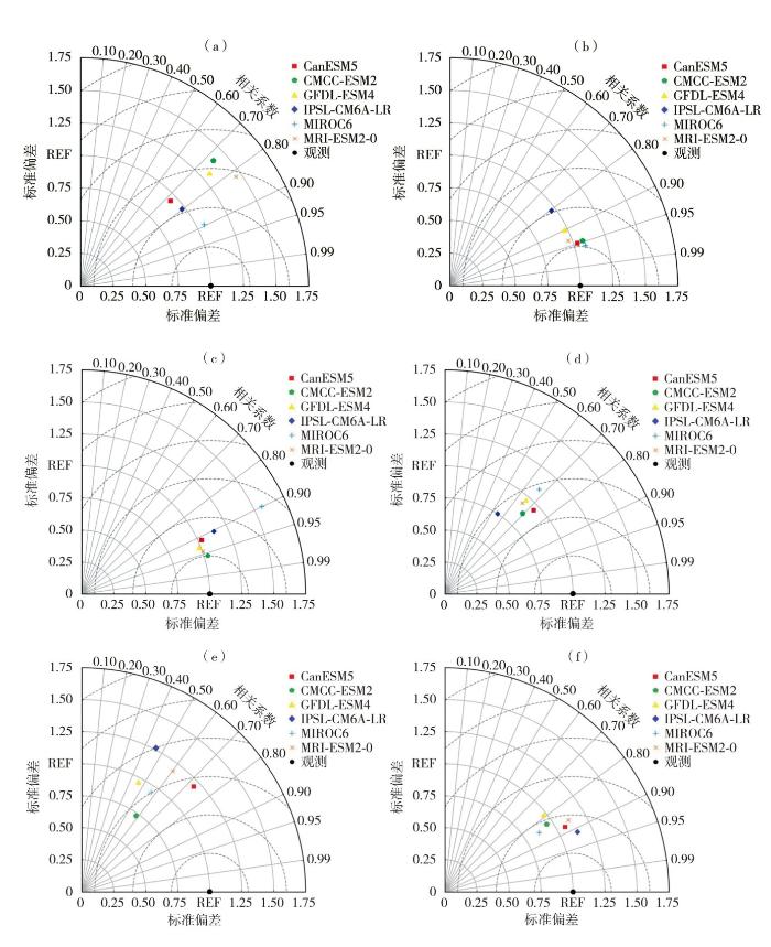 1976—2014年黄河源区观测和6个气候模式模拟的不同气象要素泰勒图