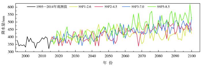 The interannual variation of observed precipitation from 1995 to 2014 and projected precipitation under different emission scenarios by the CMIP6 multi-model from 2015 to 2100 at Tangnaihai Station in the source area of the Yellow River