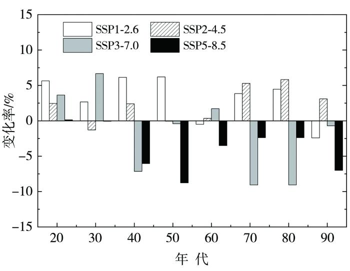 不同排放情景下21世纪不同年代黄河源区唐乃亥站径流量相对历史时期(1976—2018年)的变化率