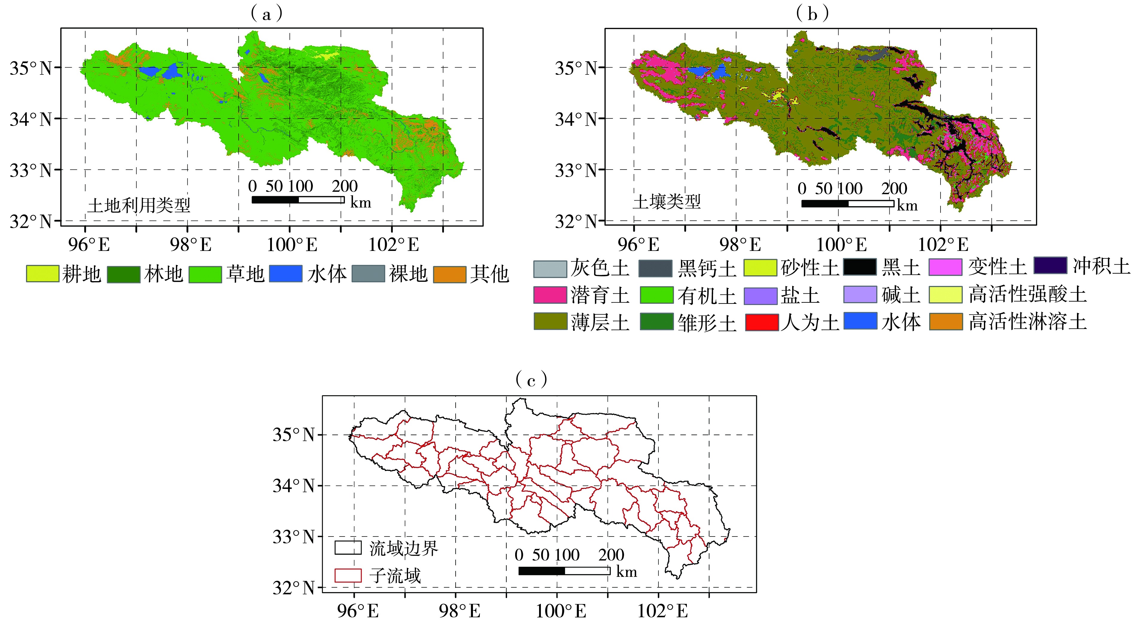 | 图2 黄河源区土地利用类型(a)、土壤类型(b)及其子流域划分(c) |